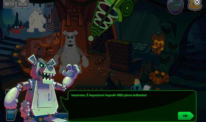 Olá pinguim! Finalmente as últimas missões da Festa de Halloween foram desbloqueadas. Agora já é possível solucionar esse mistério e dar um fim a esses robôs descontrolados de uma vez por todas! Quem será que esta por trás deles? Rookie o encontrará no Centro, e assim ele irá conduzi-lo ao Plaza. Todos nós sabemos que o maior medo do Rookie são PALHAÇOS! Será fácil sobrecarregar o Rookiebô.